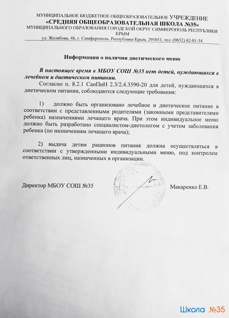 Особое внимание уделяется организации питания учащихся (организатор питания – МУП «Горпищеторг») Буфет рассчитан на 42 посадочных места. Горячее питание готовит пищеблок МБОУ «Школа-гимназия №10» г. Симферополя и, затем, оно доставляется в специальной таре спецтранспортом МУП «Горпищеторг» в "СОШ №35 им. Е.Ф. Дерюгиной". Материальная база буфет представлена: холодильником, электробойлером для пользования горячей воды, мармитом (для первых и вторых блюд), прилавком для буфетной продукции, шкафами для хранения моющих и дезсредств, микроволновой печью.
