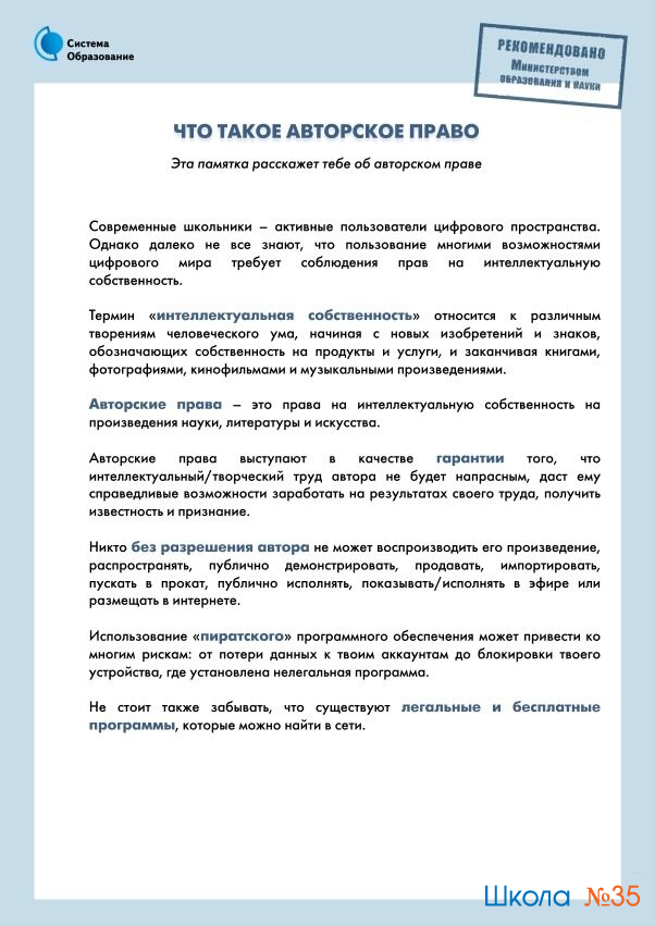 Современные школьники - активные пользователи цифрового пространства. Однако далеко не все знают, что пользование многими возможностями цифрового мира требует соблюдения прав на интеллектуальную собственность.